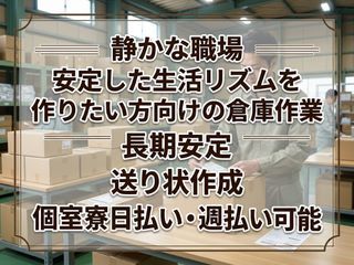 静かな職場 安定した生活リズムを作りたい方向けの倉庫作業 長期安定 送り状作成 個室寮日払い・週払い可能【正社員】